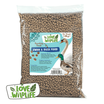 Move over sad looking, nutrient deficient bread, and say hello to our tasty, nutritious Love Wildlife Swan & Duck Food. Our Swan & Duck Food contains the perfect, nutritious pellets to feed wild waterfowl of all shapes, species, and sizes. Packed full of delicious, healthy ingredients, such as salmon meal and sunflower seeds, this food is brimming with vitamins and minerals that are essential for swans and ducks to thrive. Easy to scatter feed to encourage your local water birds to peck. This food is especially great to feed during the winter months when food is more scarce, as it is naturally high in protein and good fats, providing birds with the energy that they need.