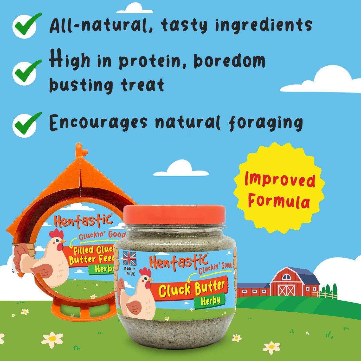Peanut butter for chickens? Absolutely! Our Hentastic Cluck Butter is packed with premium vegetable fat, British flour, mixed seeds, and a dash of herbs. This easy-to-feed treat will keep your hens happy, healthy, and entertained!